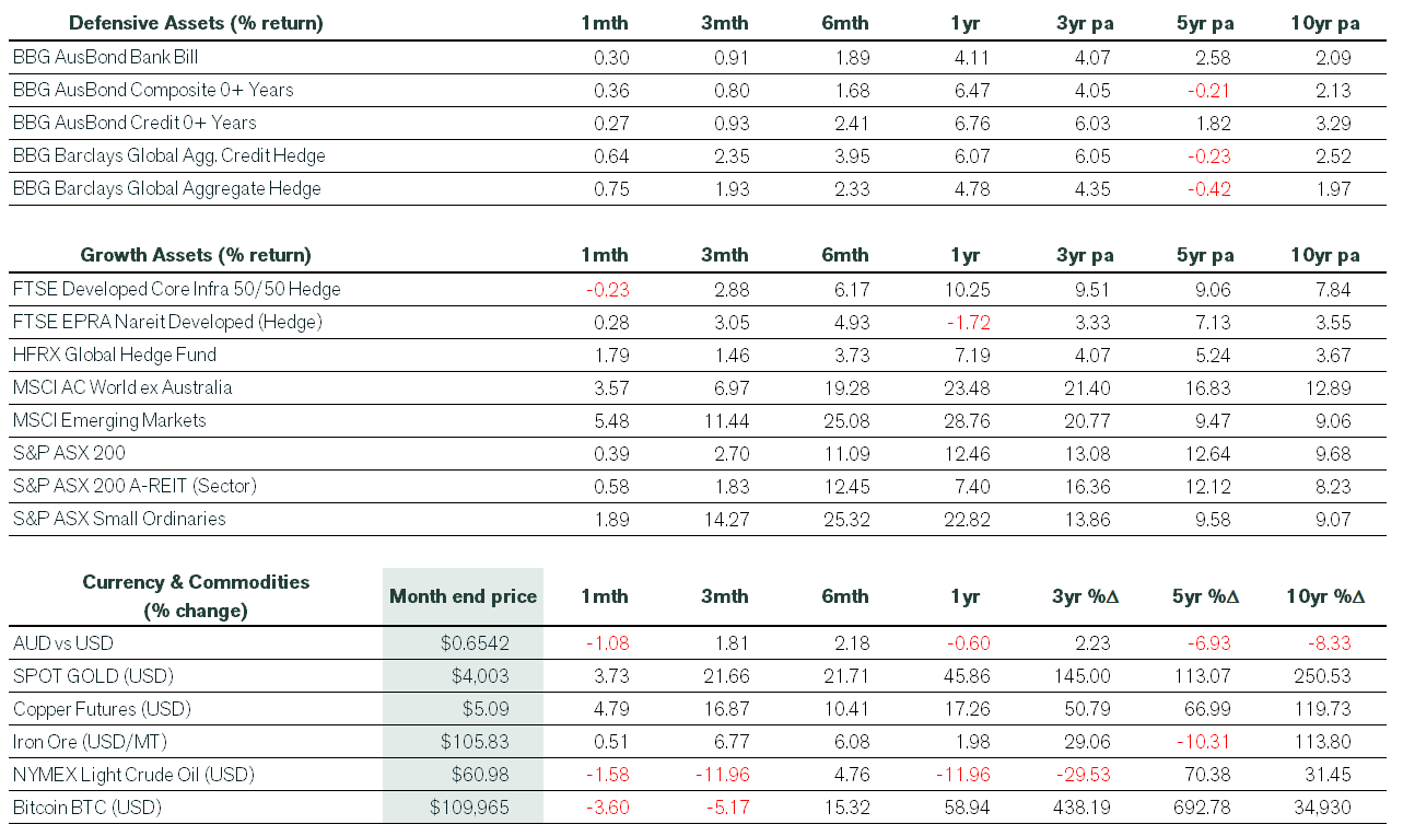 Financial markets continued their upward trend in October, with almost every major asset class delivering positive returns. The global rally continued despite alarming trade news about China’s export controls on rare earth minerals. Later in the month, the Fed reduced its funds rate by a further 0.25% to a range of 3.75%-4%. Although the US government shutdown remained ongoing, growing inflation risks meant that further rate relief in December was “not a foregone conclusion”. This forced traders to recalibrate their interest rate forecasts, leading to a spike in volatility.