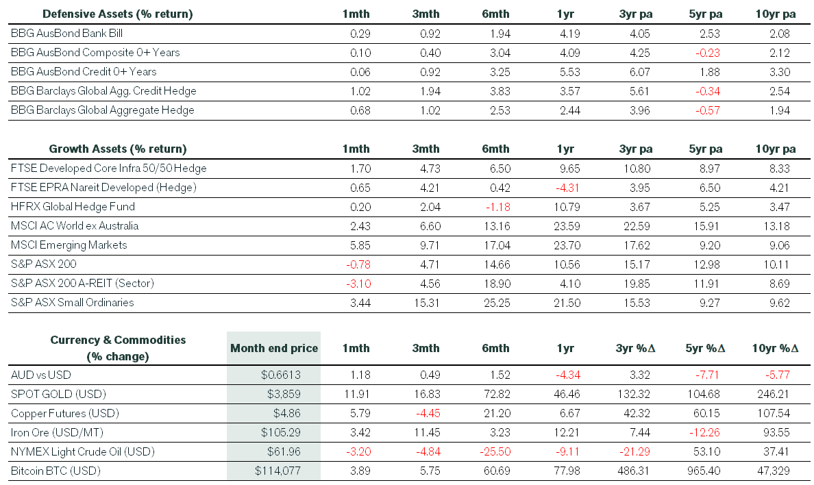 In bond markets, investors were more bullish as 10-year US Treasurys closed at 4.16%, down 7 basis points from the previous month, while 30-year bonds nudged 2 basis points lower to 4.74%. Credit spreads narrowed further, helping the global credit benchmark to return over 1% in September. However, domestic fixed interest underperformed global peers. While the Reserve Bank of Australia (RBA) kept interest rates on hold at 3.60% in September, as expected, the monthly CPI data was above consensus. This suggested September’s quarterly inflation data might exceed the RBA’s forecast, resulting in money market traders repositioning towards just one rate cut in early 2026.
